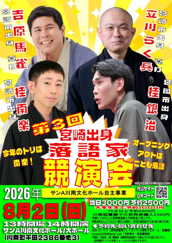 吉原馬雀(宮崎市出身)、立川らく兵(宮崎市出身)、桂銀治(延岡市出身)、桂南楽(宮崎市出身)が出演。それぞれの個性と話芸がぶつかり合う、ここでしか味わえない落語会です。