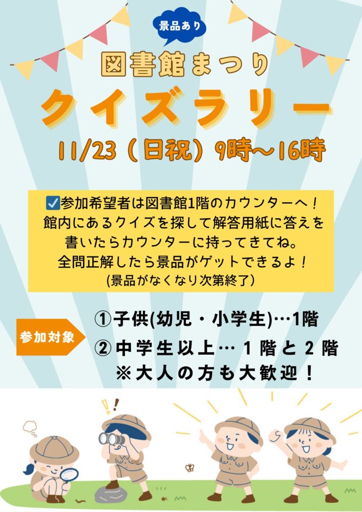 11月23日(日・祝)の図書館まつりの日、図書館内では9時から『クイズラリー』を行います✨