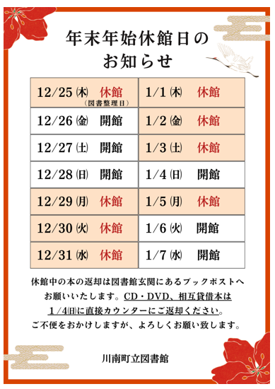 CD、DVD、他館からお借りしている相互貸借の本につきましては、破損のおそれがありますのでブックポストのご利用はお控えいただき、1月4日㈰、1月6日㈫以降にカウンターにご返却ください。